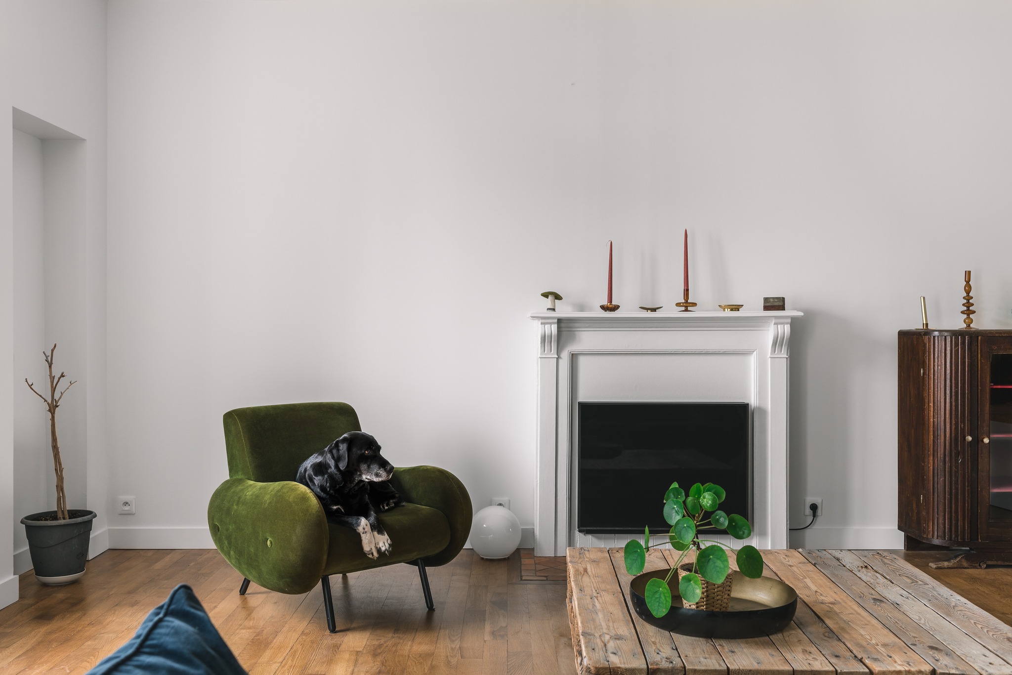 Dans la cuisine, des poignées dorées mat et les agencements. Le plan de travail est du stratifié bois. Nous avons réalisé sur-mesure un beau meuble TV arrondi ainsi qu’une verrière arrondie également. Les peintures proviennent de chez Little Green, teinte « jewel » et » rose » et de chez la malouinière * teinte « jaune septembre »